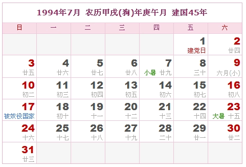 1994年7月 农历甲戌(狗)年庚午月 建国45年