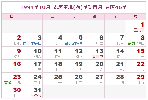 1994年10月 农历甲戌(狗)年癸酉月 建国46年