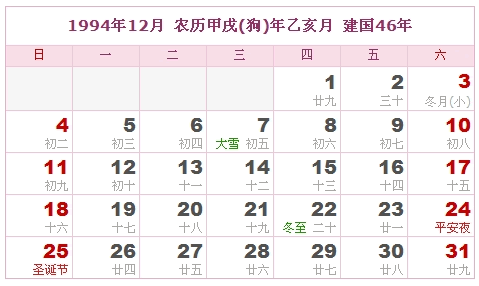 1994年12月 农历甲戌(狗)年乙亥月 建国46年