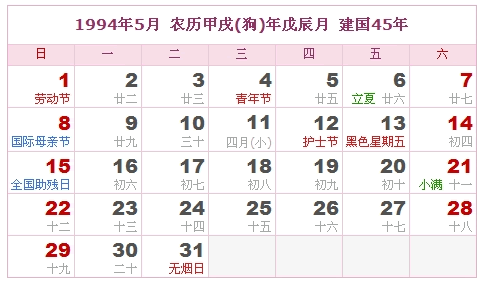 1994年5月 农历甲戌(狗)年戊辰月 建国45年