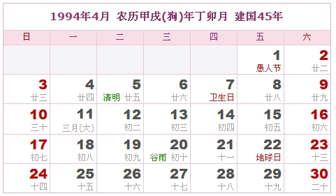 1994年4月 农历甲戌(狗)年丁卯月 建国45年