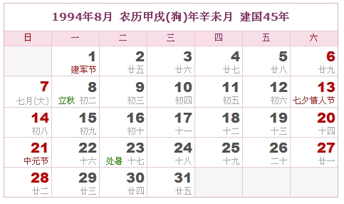 1994年8月 农历甲戌(狗)年辛未月 建国45年