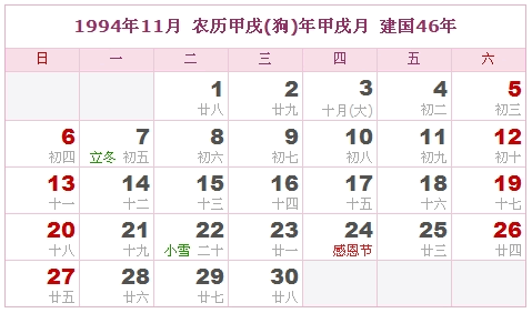 1994年11月 农历甲戌(狗)年甲戌月 建国46年