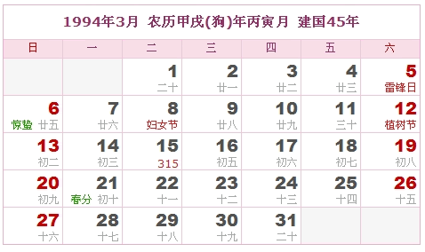 1994年3月 农历甲戌(狗)年丙寅月 建国45年