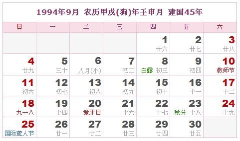 1994年9月 农历甲戌(狗)年壬申月 建国45年