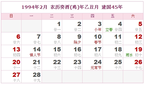 1994年2月 农历癸酉(鸡)年乙丑月 建国45年