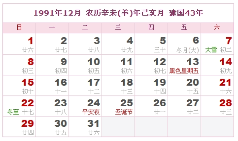 1991年12月 农历辛未(羊)年己亥月 建国43年