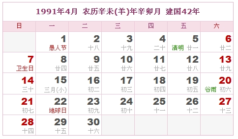 1991年4月 农历辛未(羊)年辛卯月 建国42年