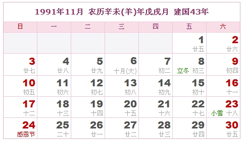 1991年11月 农历辛未(羊)年戊戌月 建国43年