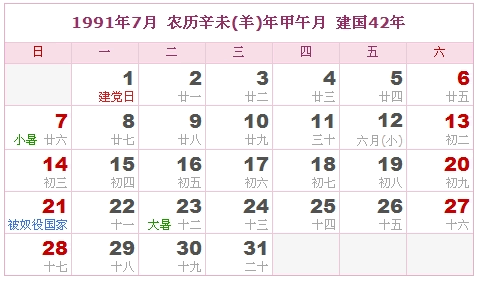1991年7月 农历辛未(羊)年甲午月 建国42年