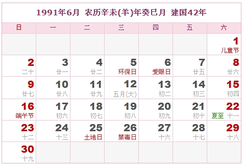 1991年6月 农历辛未(羊)年癸巳月 建国42年