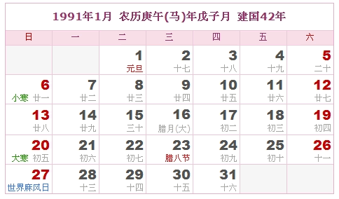 1991年1月 农历庚午(马)年戊子月 建国42年