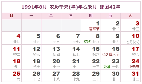 1991年8月 农历辛未(羊)年乙未月 建国42年