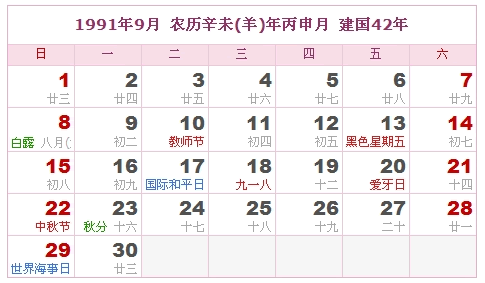 1991年9月 农历辛未(羊)年丙申月 建国42年