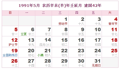 1991年5月 农历辛未(羊)年壬辰月 建国42年