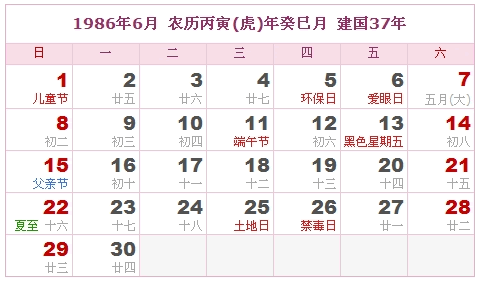 1986年6月 农历丙寅(虎)年癸巳月 建国37年
