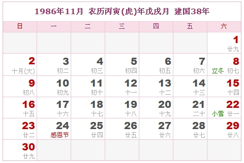 1986年11月 农历丙寅(虎)年戊戌月 建国38年