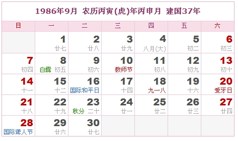 1986年9月 农历丙寅(虎)年丙申月 建国37年