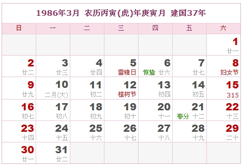 1986年3月 农历丙寅(虎)年庚寅月 建国37年