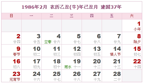 1986年2月 农历乙丑(牛)年己丑月 建国37年