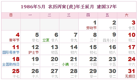1986年5月 农历丙寅(虎)年壬辰月 建国37年