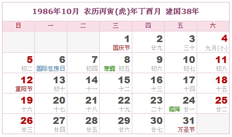 1986年10月 农历丙寅(虎)年丁酉月 建国38年