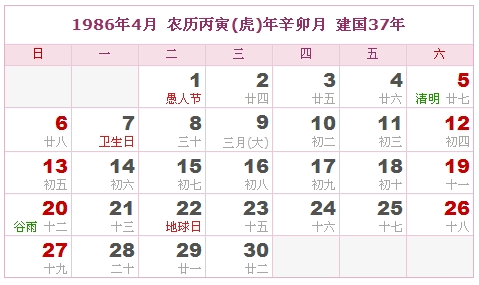 1986年4月 农历丙寅(虎)年辛卯月 建国37年