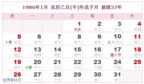 1986年1月 农历乙丑(牛)年戊子月 建国37年