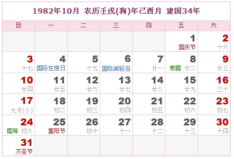 1982年10月 农历壬戌(狗)年己酉月 建国34年