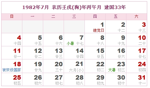1982年7月 农历壬戌(狗)年丙午月 建国33年