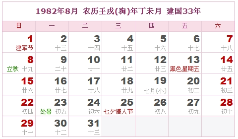 1982年8月 农历壬戌(狗)年丁未月 建国33年