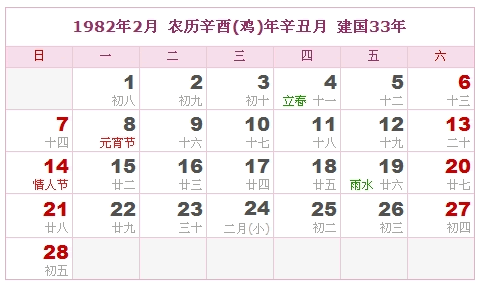 1982年2月 农历辛酉(鸡)年辛丑月 建国33年
