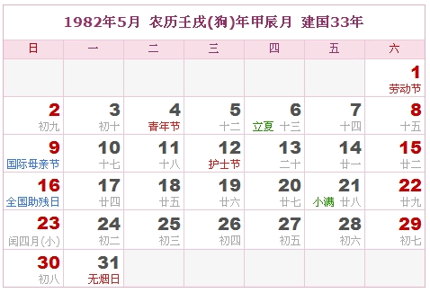 1982年5月 农历壬戌(狗)年甲辰月 建国33年