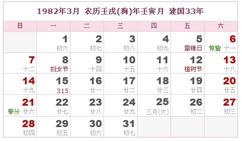 1982年3月 农历壬戌(狗)年壬寅月 建国33年