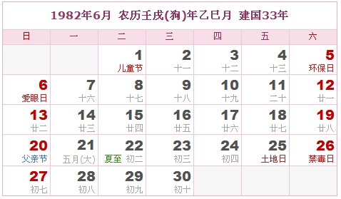 1982年6月 农历壬戌(狗)年乙巳月 建国33年