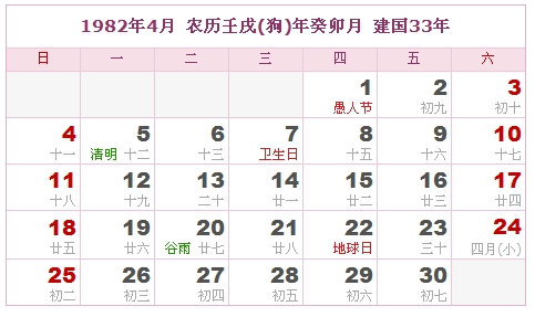 1982年4月 农历壬戌(狗)年癸卯月 建国33年