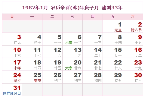 1982年1月 农历辛酉(鸡)年庚子月 建国33年