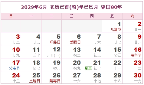 2029年6月 农历己酉(鸡)年己巳月 建国80年