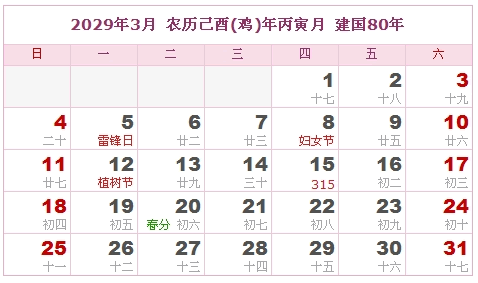 2029年3月 农历己酉(鸡)年丙寅月 建国80年