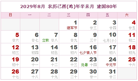 2029年8月 农历己酉(鸡)年辛未月 建国80年