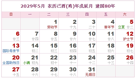2029年5月 农历己酉(鸡)年戊辰月 建国80年