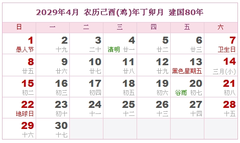 2029年4月 农历己酉(鸡)年丁卯月 建国80年