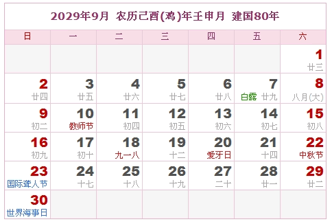 2029年9月 农历己酉(鸡)年壬申月 建国80年