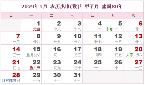 2029年1月 农历戊申(猴)年甲子月 建国80年