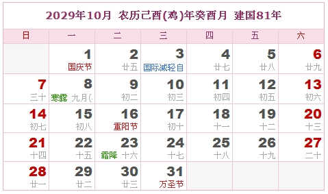 2029年10月 农历己酉(鸡)年癸酉月 建国81年