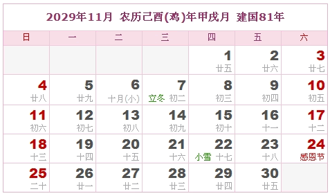 2029年11月 农历己酉(鸡)年甲戌月 建国81年