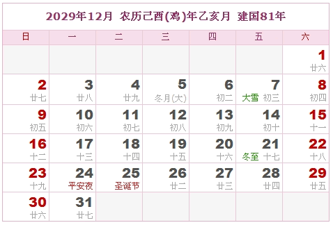 2029年12月 农历己酉(鸡)年乙亥月 建国81年